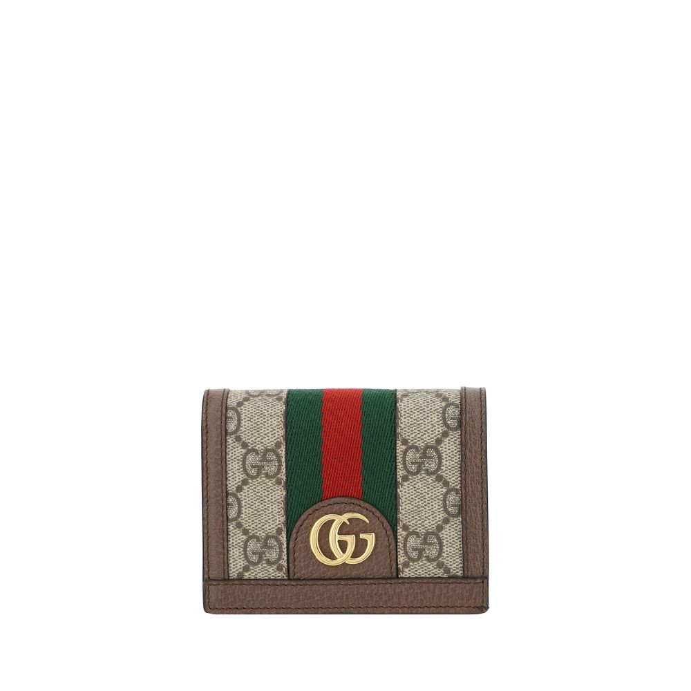 Wallet by Gucci, all-over jacquard printed GG Supreme motif, snap button closure, GG logo plaque on front, leather details, card slots, bill compartment, zippered pota coin pocket inside.