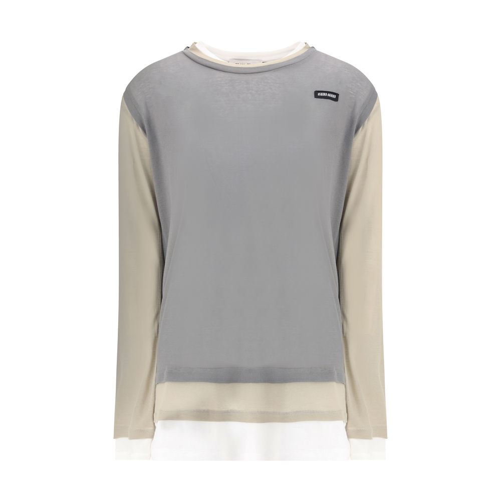 Miu Miu’s Long sleeve T-Shirt is an essential garment that combines comfort and distinctive style. Made of pure cotton, it offers a soft and natural feel against the skin. The classic crew-neck design is enhanced by a logo applique on the chest, a refined detail that certifies its authenticity. Layered piping adds a touch of originality and dynamism to the silhouette, making it perfect for completing casual outfits with understated, modern elegance.