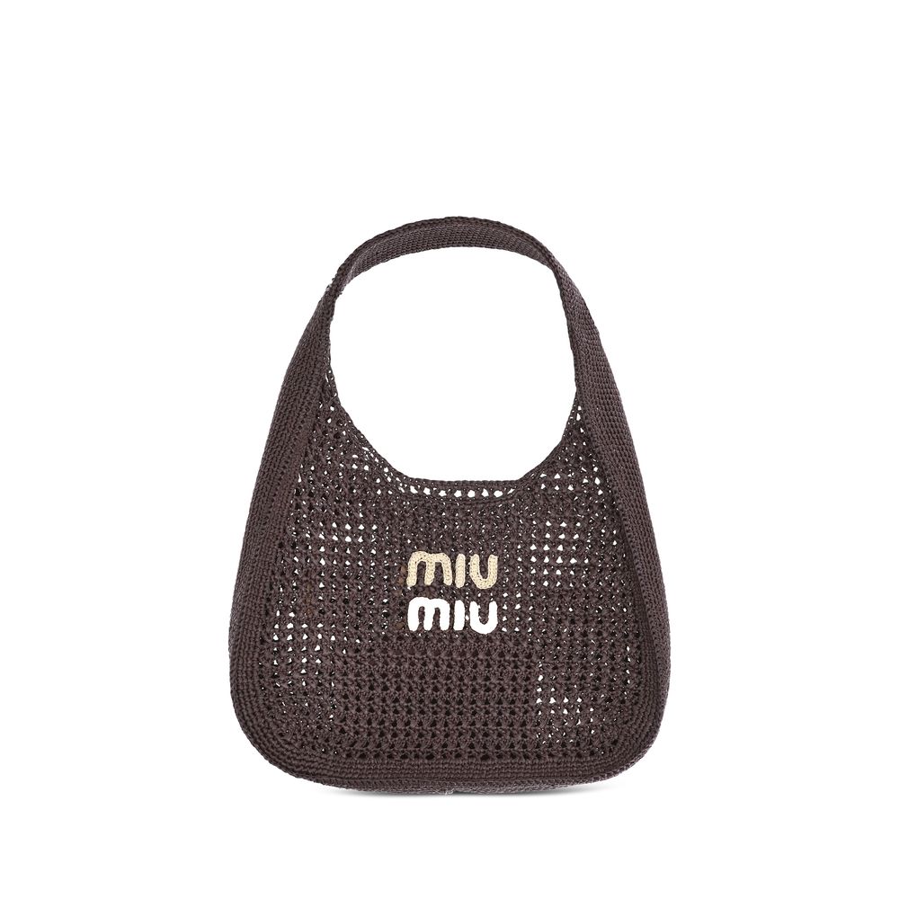 Raffia Shoulder Bag by Miu Miu features a perforated crochet design, perfect for summer looks. The iconic embroidered monogram on the front adds a distinctive, handcrafted touch. The interior features a single compartment, ideal for holding essentials with lightness and style. An accessory that combines bohemian spirit and brand identity.
