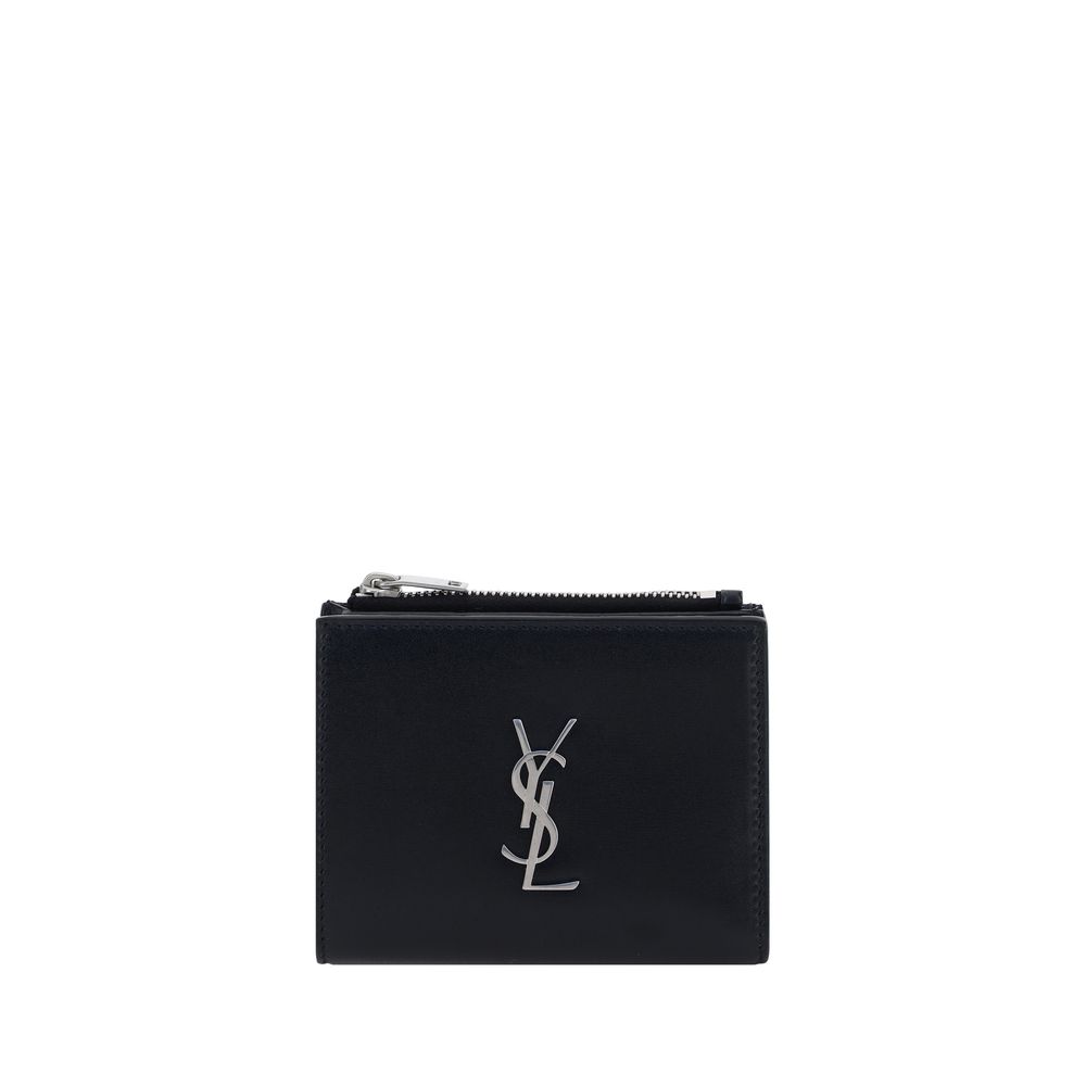 Calfskin Card Holder by Saint Laurent, card slots inside, embossed iconic brand logo plaque on front, coin compartment with top zipper closure, billfold design with snap button.